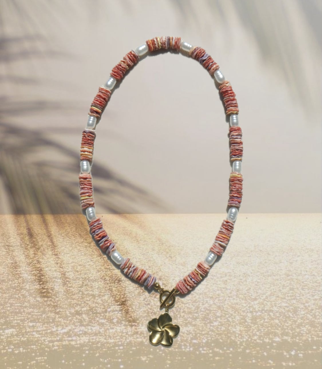 サンセットのような温かみのあるビーズと、パールビーズを組み合わせたネックレス。